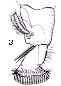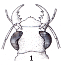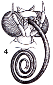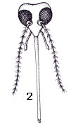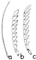 Gliedern besteht (a). Diesen Grundtyp langer Geisselantennen finden wir z.B. bei den Uferfliegen, Schaben, Heuschrecken und vielen anderen Gruppen. Die Antennen sind in der Regel aber verschieden ausgebildet, manchmal tragen die Glieder der Geissel verschiedene Haare oder Borsten (b) oder lange ein- bis zweireihige kammartige Fühlerfortsätze (c), die Geissel kann aber auch nur borstenförmig und ungegliedert sein. Die Anzahl und Form der Antennenglieder sind immer wichtige Bestimmungsmerkmale. |
