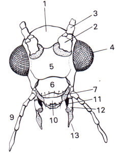 Scheitel Antennenschaft zweites Antennenglied Komplexaugen Stirn Kopfschild Unterkiefer Kiefertaster Oberlippe Teile des Kiefers Lippentaster |